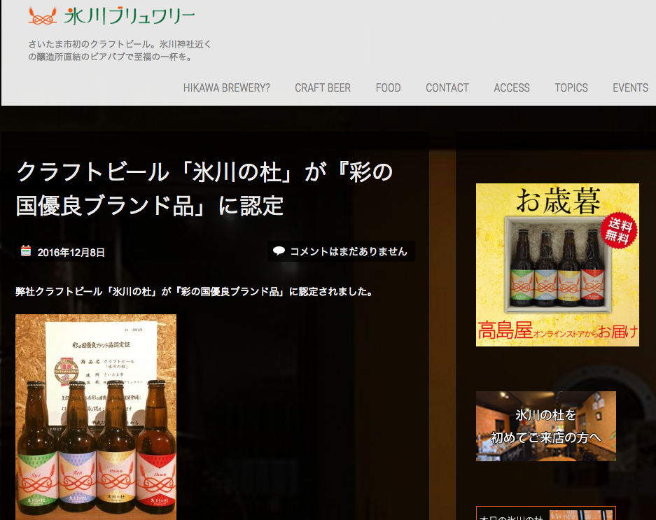 氷川ブリュワリーがつくるクラフトビール「氷川の杜」が、「彩の国優良ブランド品」に認定された。